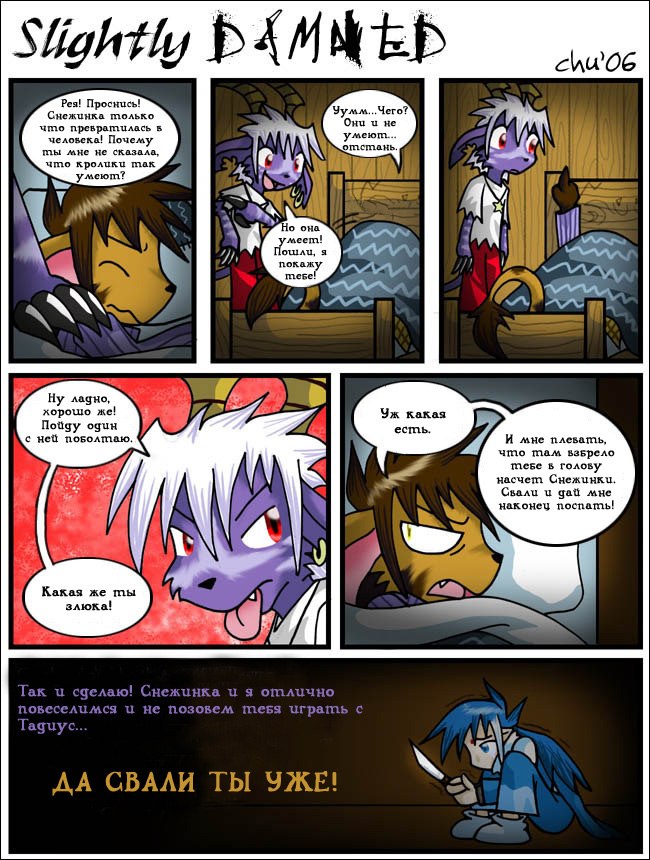 Hiya all! I'm gonna keep it short. July was a very busy month, and tomorrow I'll be off to another convention: Anthro Weekend Utah! I'm sorry I only managed to update Slightly Damned once this month. I did manage to get more pages done, but I decided I should wait until after I'm back from the convention to post more.