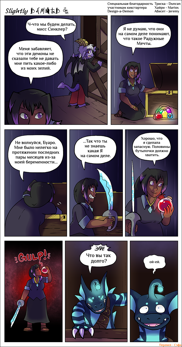 Hiya all! I'm gonna keep it short. July was a very busy month, and tomorrow I'll be off to another convention: Anthro Weekend Utah! I'm sorry I only managed to update Slightly Damned once this month. I did manage to get more pages done, but I decided I should wait until after I'm back from the convention to post more.